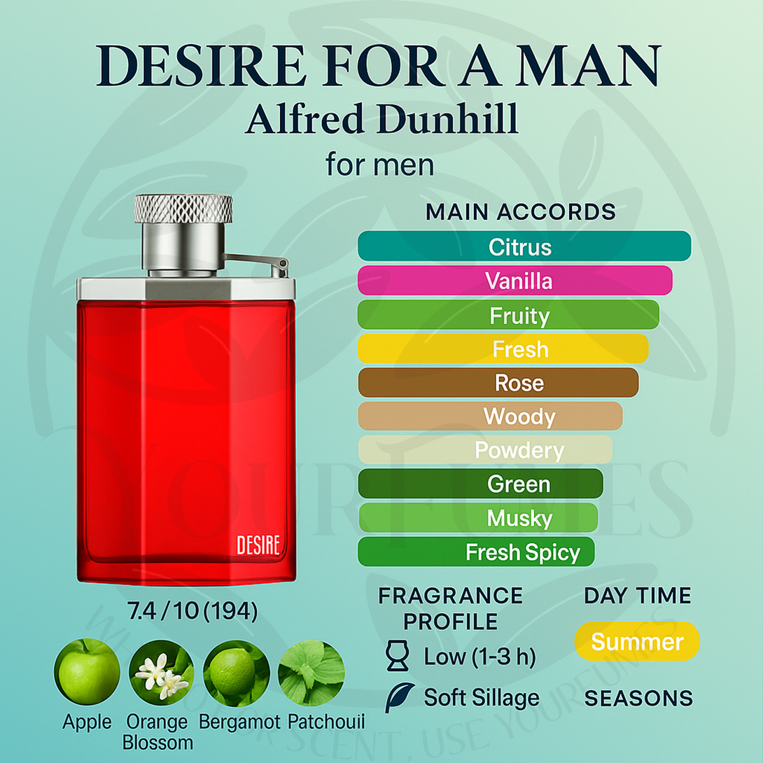 Desire for a Man Eau de Toilette (2000) is Alfred Dunhill’s iconic red‑flacon fragrance for men, created by master perfumer Michel Almairac. It opens with crisp apple, bergamot and sparkling lemon layered over sweet orange blossom. The heart...