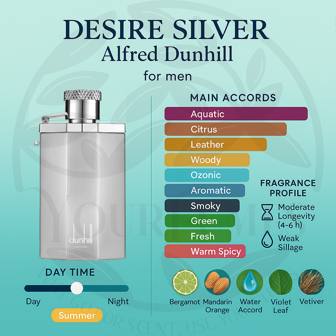 Alfred Dunhill Desire Silver Eau de Toilette is a cool, contemporary men’s fragrance (2015) that pairs sparkling bergamot and mandarin with an airy water accord and aromatic cardamom. A clean heart of violet leaf flows into an elegant dry‑down of Haitian vetiver, birchwood and warm amber, delivering 6–8 hours of crisp, masculine freshness—perfect for office days, summer evenings and any moment that calls for understated sophistication.