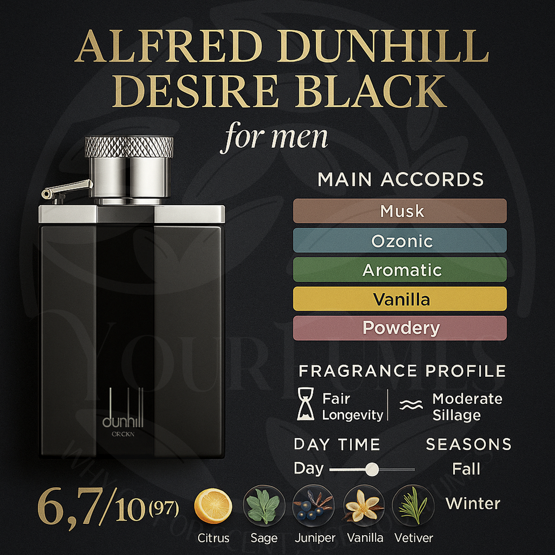 Alfred Dunhill Desire Black Eau de Toilette (2014) is a captivating oriental-fougère for men, fusing modern edge with British refinement. It opens with sharp black pepper, sunlit bergamot and juicy grapefruit, then reveals a heart of saffron, noble cypress and Turkish rose. The deep base of smoky vetiver, resinous olibanum and warm amber leaves a bold trail that endures 6–8 hours with moderate-strong projection. Housed in a sleek black flacon, Desire Black is perfect for evening engagements, cooler seasons or any occasion when understated sophistication is required