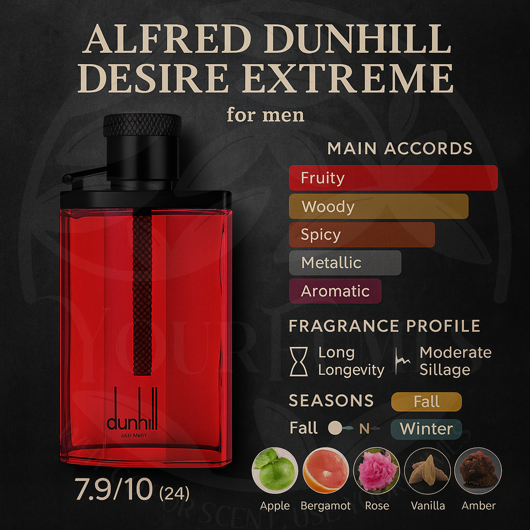 Alfred Dunhill Desire Extreme Eau de Toilette is a bold, leather-dominant men’s fragrance launched in 2017. It ignites with tangy blood orange, exotic saffron and bright bergamot before unfolding into a smoky heart of cypress and clary sage. A deep base of rich leather, warm amber, earthy patchouli and vetiver leaves a confident, long-lasting trail—perfect for evening occasions, date nights or cooler-season wear.