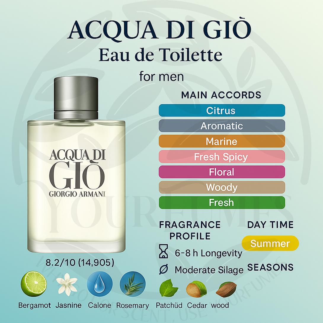 Acqua di Giò Eau de Toilette (1996) is the archetype of modern aquatic-citrus fragrances. Inspired by the Mediterranean coast and composed by Alberto Morillas, Annick Menardo & Christian Dussoulier, it splashes open with Calabrian bergamot, lime and neroli over crystalline sea notes. A breezy heart of jasmine, peach, rose and aquatic accord drifts into a masculine base of cedar, oakmoss, patchouli and warm musk. Expect 6–8 hours of refreshing longevity and moderate projection—ideal for office days, beach escapes and any time you want effortless sophistication.