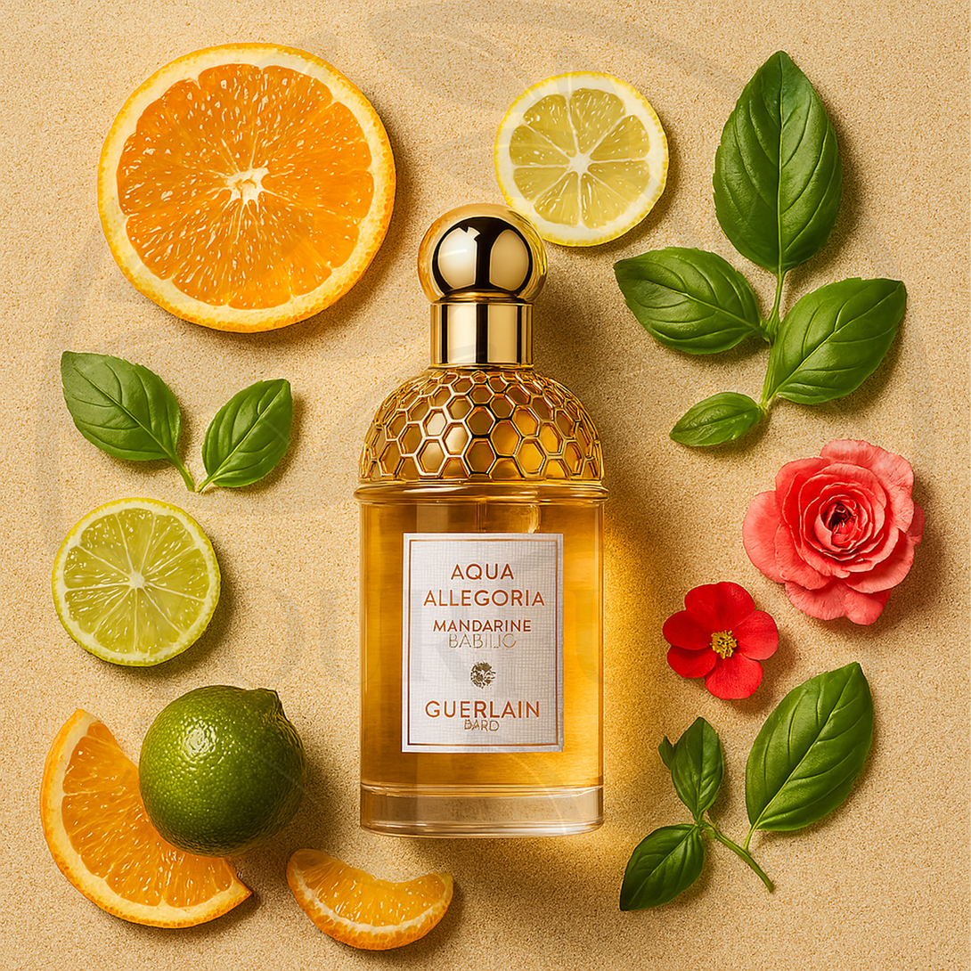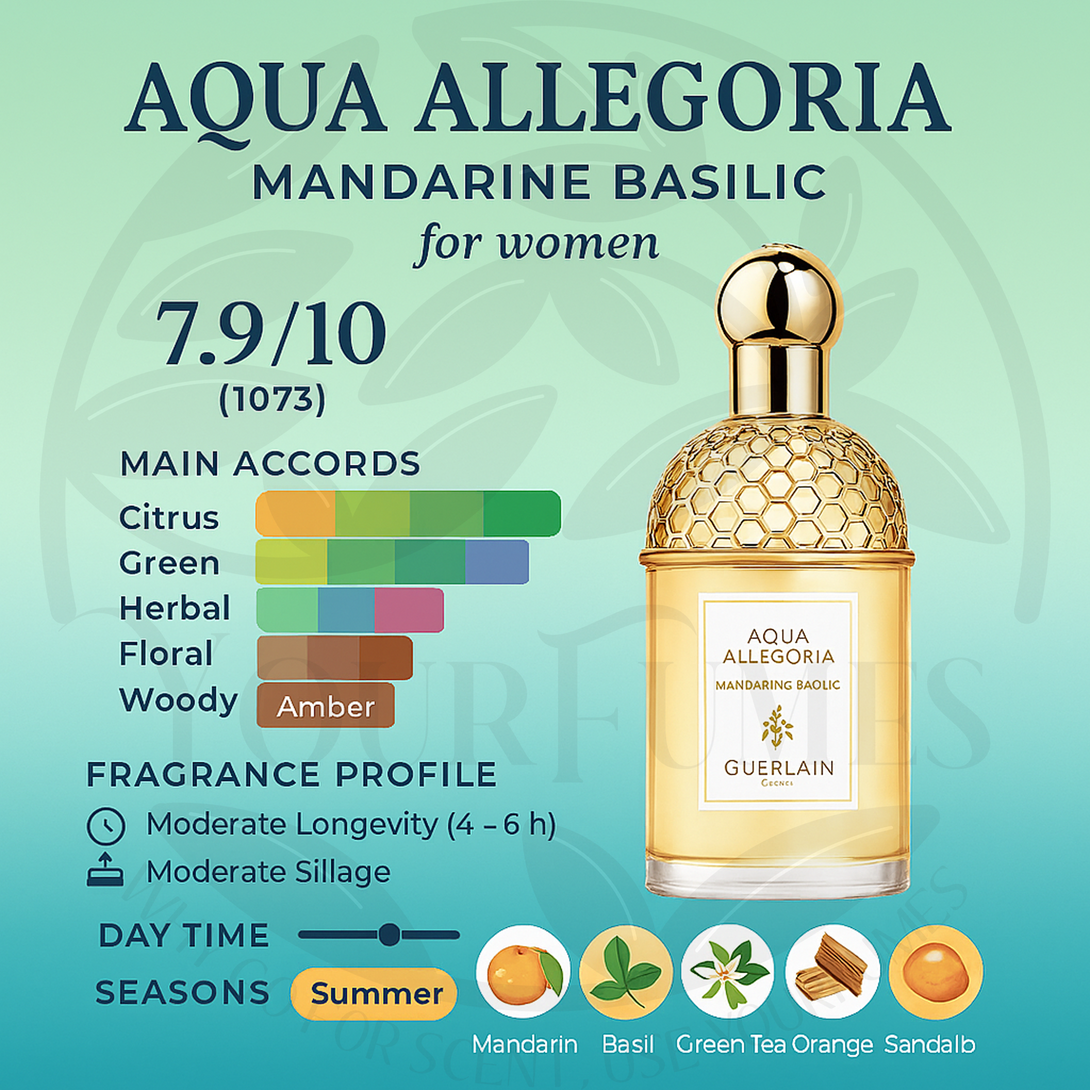 Aqua Allegoria Mandarine Basilic Eau de Toilette (2007) is a sun-lit citrus-herbal fragrance created by perfumer Marie Salamagne. It splashes open with juicy mandarin, clementine and bitter orange, brightened by green tea and ivy. The heart pairs freshly torn basil leaves with mandarin pulp and neroli, before a soft base of amber-tonka and light woods dries down for 5–6 hours of breezy, feel-good freshness—perfect for hot days, relaxed brunches and outdoor adventures.